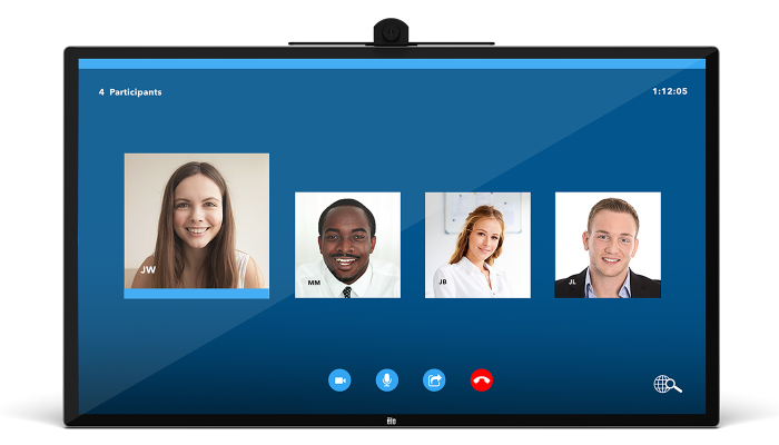 Konferenční kamera Elo<br>Snadné videokonference<br>Konferenční kamera, navržená pro konferenční místnosti a jednací místnosti, poskytuje video v plném HD rozlišení se širokými pozorovacími úhly a nastavitelným umístěním pro pokrytí jakékoli konfigurace s